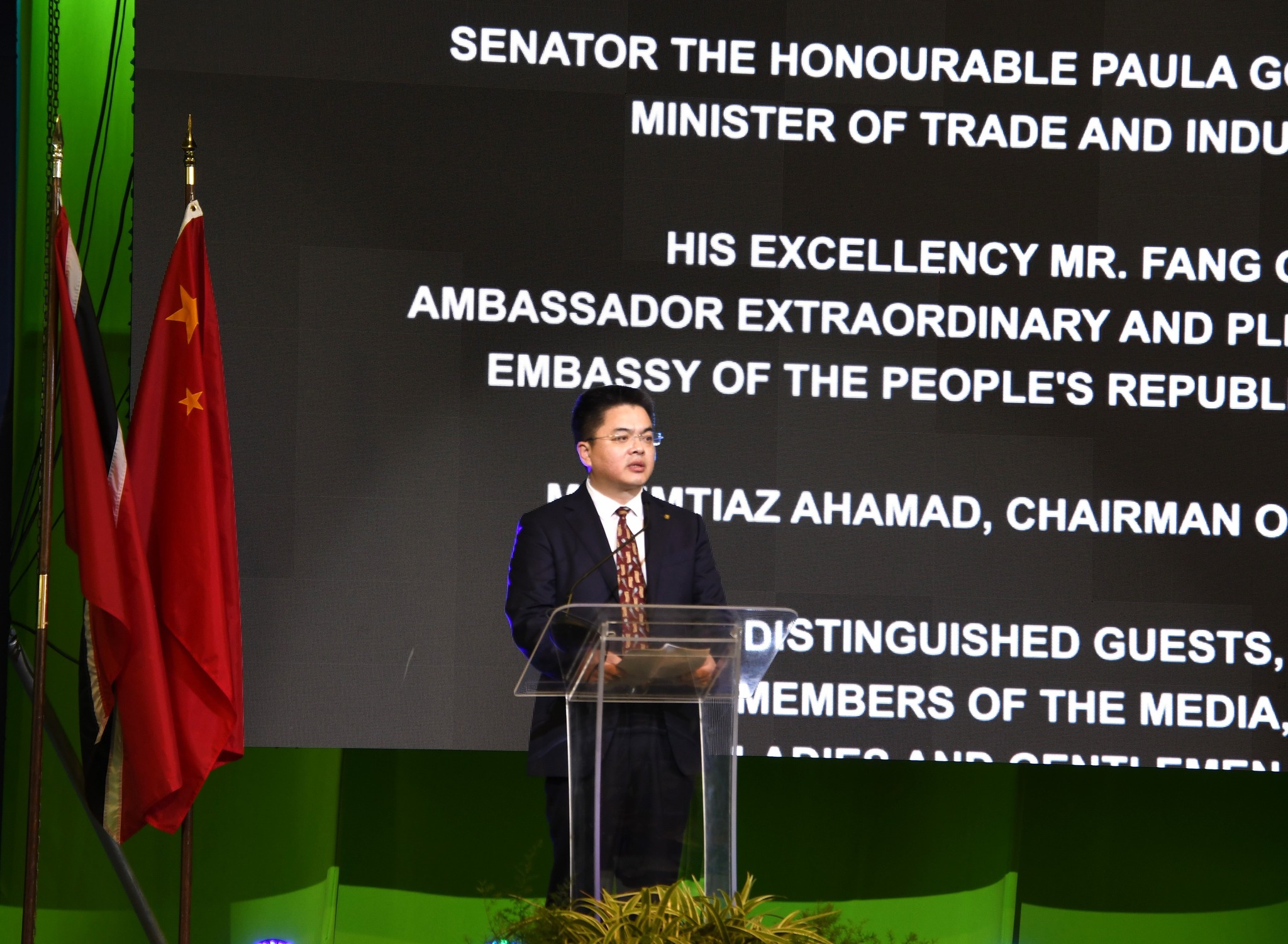 Also speaking at the event were e TecKβs chairman Imtiaz Ahamad, Beijing constructionβs Deputy General Manager He Haiqi, and Chinaβs Ambassador to T&T Fang Qui. The vote of thanks was delivered by Ms. Franka Costelloe, chairman of invesTT.
